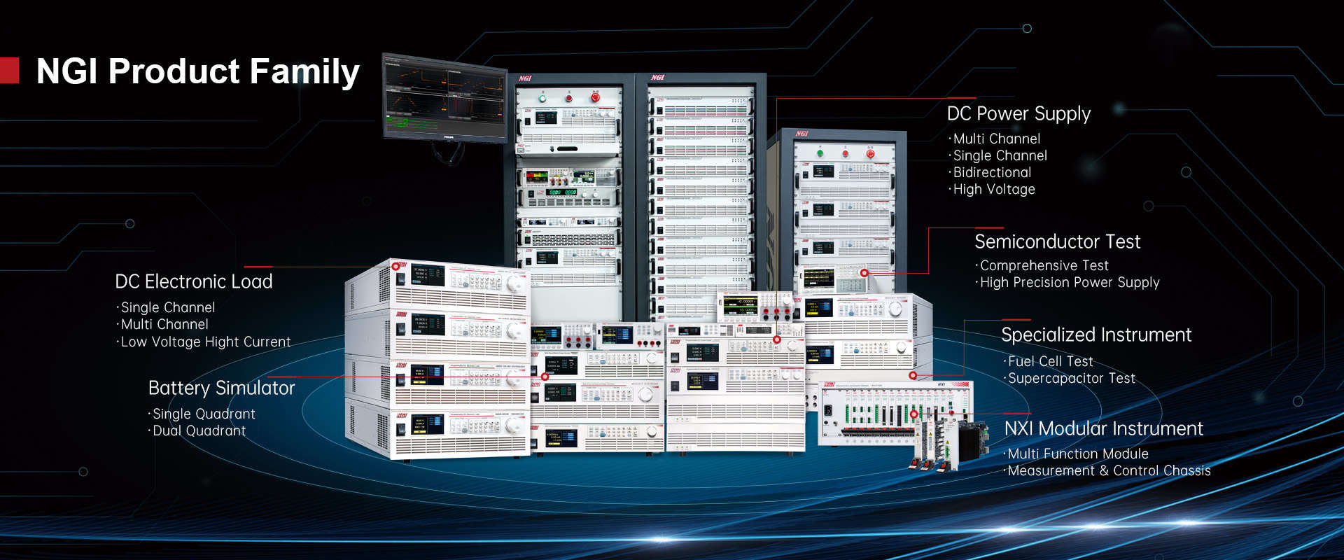 Let's take the lithium battery for example. The battery must cooperate with charge and discharge management system (BMS) to ensure normal operation and characteristics. It is complicated to simulate the battery characteristics and evaluate BMS performance. However, if the functions of power output and absorption are integrated into a standalone instrument, the complexity of using separate DC power supply and electronic load to configure power output and absorption can be reduced greatly. After integrating these functions, it can work under closed-loop control to provide a perfect, non-transient switch between output and absorption, and realize seamless switch of power and load. In order to meet the present dual-quadrant and industry test application requirements, NGI developed N8358 high-accuracy eight-channel programmable battery simulator.